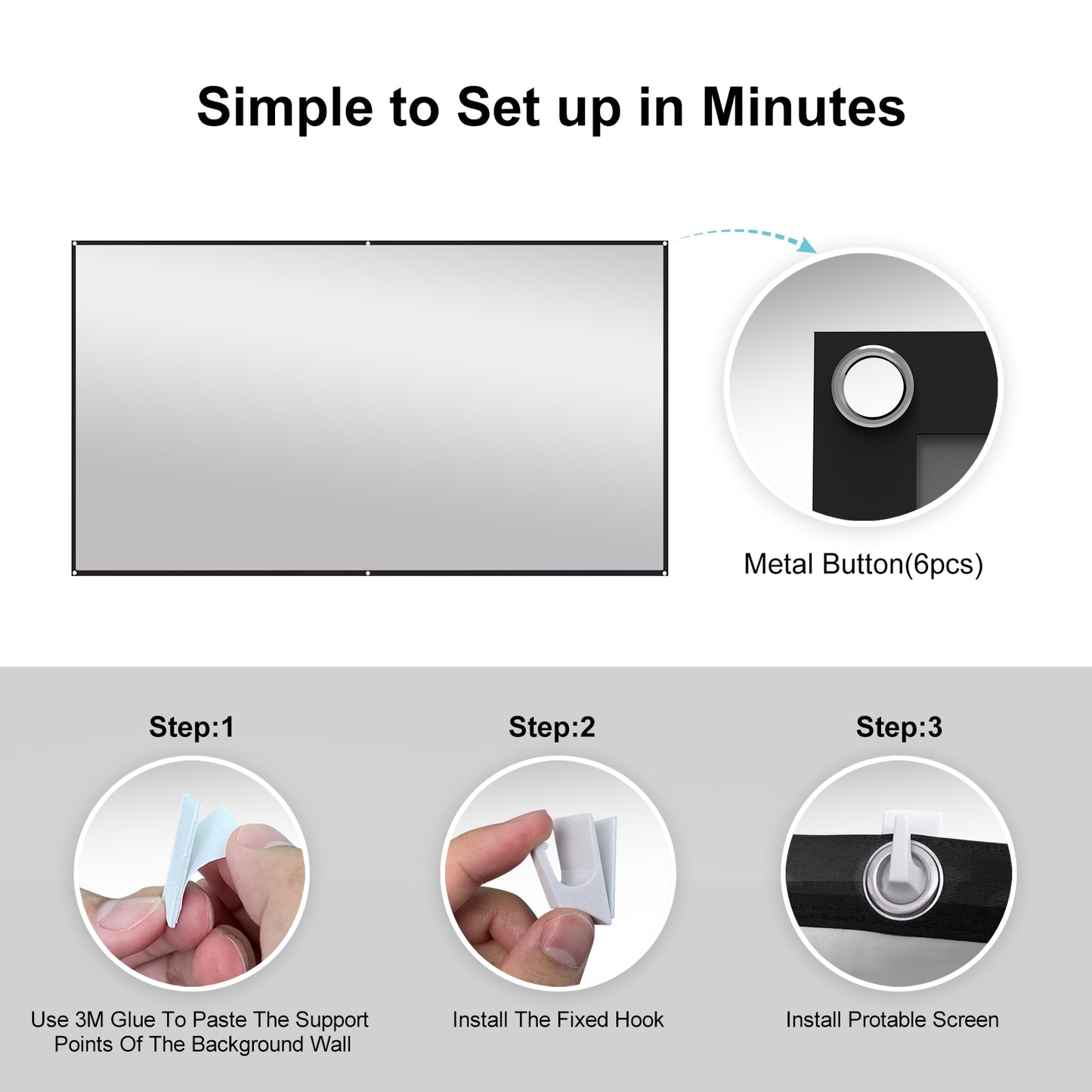 <Super Easy Installation>: Lightweight and compact one-piece design, convenient to carry and easy to set up. The portable projector screen comes with 8 stickers for outdoor installation and 8 hooks for indoor wall mounting, takes just a few minutes to set up.